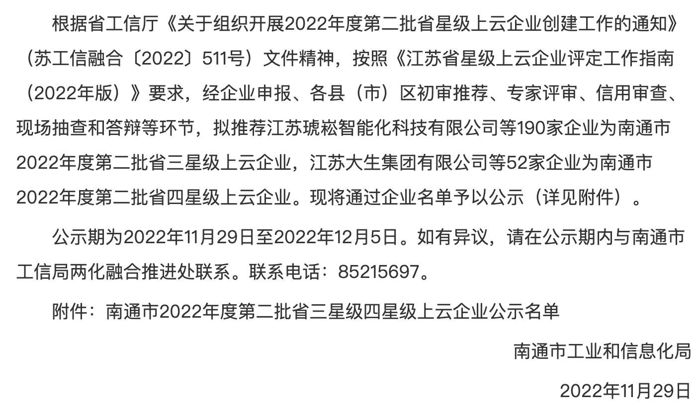 最终经过综合评审江苏琥崧智能化科技有限公司等33家客户企业通过了三星上云认定,南通润邦海洋工程装备有限公司等10家客户企业通过了四星上云认定!恭喜以上客户企业顺利通过星级上云认定!